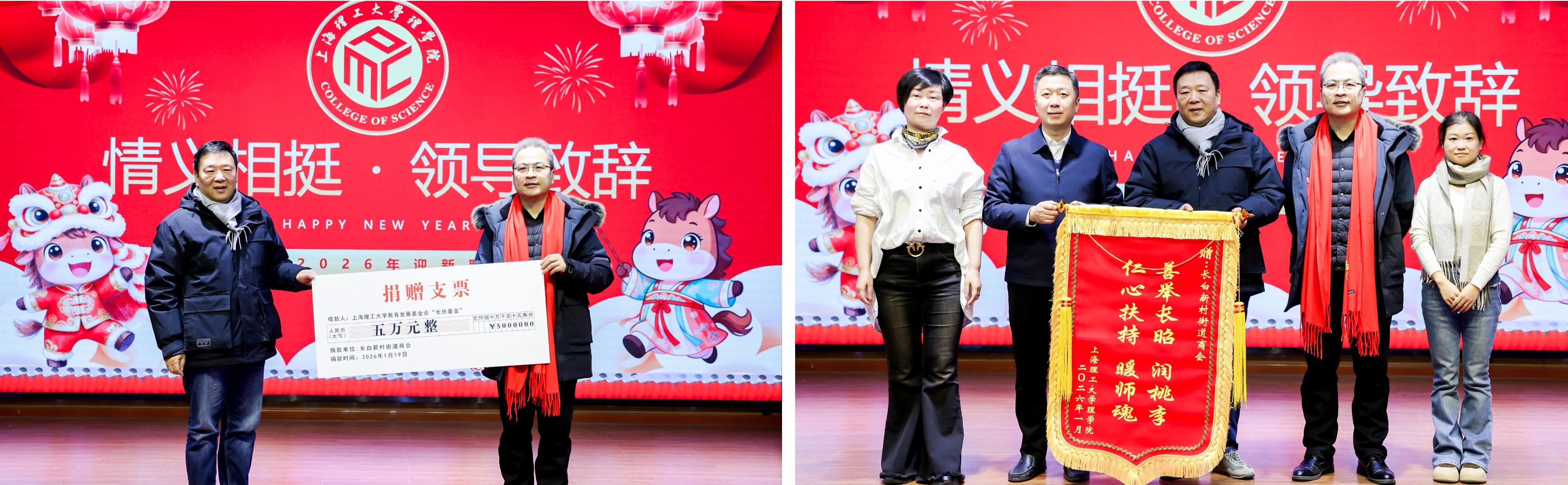活动现场,校企校友情谊深厚。长白新村街道商会与理学院隆重举行捐赠及锦旗授予仪式,姚刚书记代表商会递交捐赠牌,用实际行动续写对学院发展的支持;孟宝全书记向商会赠送锦旗,以表诚挚谢意。据悉,自2021年“长扶基金”设立以来,始终为学院学科建设、教师关怀、学生培养提供坚实支撑,成为校企协同发展的坚实纽带。此外,校友孔尧、葛文苑、马泓捐赠的精美伴手礼,承载着对母校的牵挂与祝福,让现场每一位参与者都感受到了理苑大家庭的温暖。黄吉平院长、孟宝全书记先后致辞,全面回顾了学院过去一年在教学科研、人才培养、社会服务等方面取得的丰硕成果,深情感谢社会各界、校友及全体教职工的鼎力支持,并向大家致以马年新春的美好祝福,勉励全院师生以更昂扬的姿态奔赴新征程。