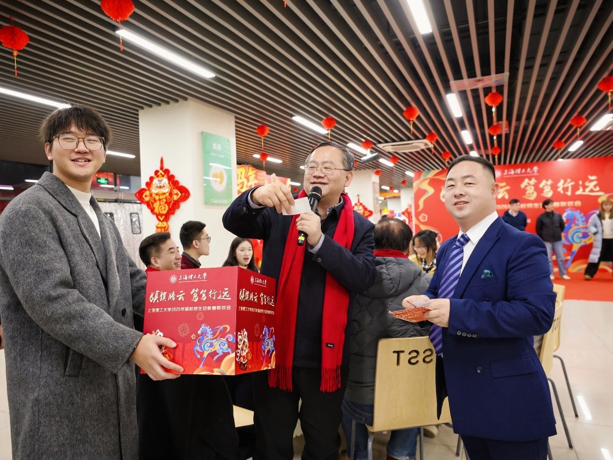 岁序更迭,暖聚校园。为扎实做好寒假留校学子的服务保障工作,让远在异乡的学子感受家的温暖,学校在2月6日举办2026年留校师生迎新春联欢会,上海市政府副秘书长、市教卫工作党委副书记、市教委主任周亚明,市教委学生处处长丁良,校党委书记王凌宇,校长朱新远,校党委副书记、副校长刘德强,副校长岳海洋等与400余名留校学子齐聚一堂,共贺新岁、共话温情,让这个新春满溢暖心温度。教委相关处室负责人,学校相关职能部门和学院党政负责人,辅导员代表等参加联欢会。