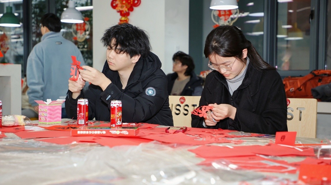 现场红灯笼高挂、福字点缀,猜灯谜、做窗花、投壶、写春联等经典项目依次铺开。学子们或凝神解谜、或巧手剪窗花、或趣味投壶互动、或挥毫写春联,将新春的美好期许凝于指尖、融于笔墨。不少国际生也主动加入,在亲身体验中探寻中国春节的文化底蕴,现场处处洋溢着团圆祥和的节日气息。