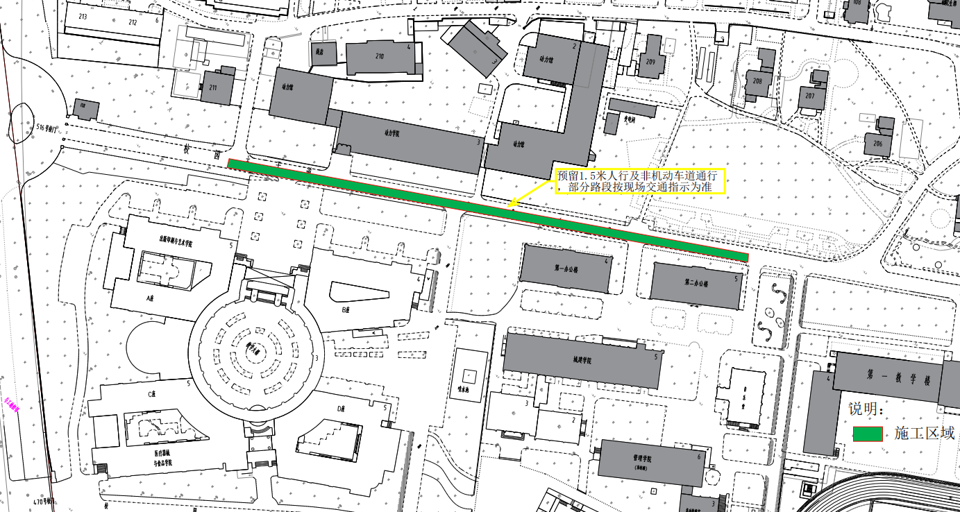 临时封路期间,道路实行半幅施工半幅通行。行人、非机动车可通过,机动车不可通行,施工完毕后将恢复正常通行。因施工期间道路路面收窄,行人、非机动车及机动车应注意观察,按现场指示缓慢通过。项目建设期间带来的不便,我们深表歉意,恳请大家谅解。也请在校师生务必远离施工区域,注意通行安全,提前规划出行路线。