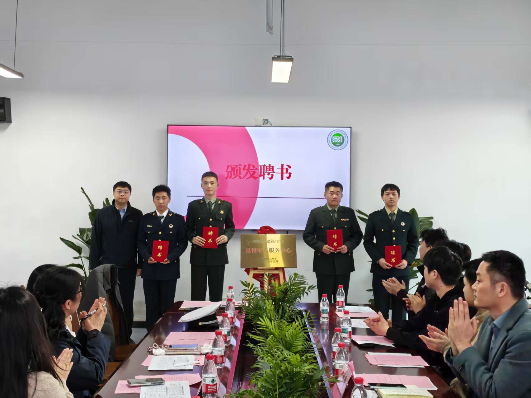 卢萧与曹桂馥共同为环境与建筑学院退役大学生服务中心揭牌。未来,该中心将提供政策咨询、学业辅导、心理疏导、就业推荐等“一站式”服务,打造退役学生的“温暖之家”。为进一步强化服务中心职能,朱垌烨为服务中心负责人颁发了聘书。