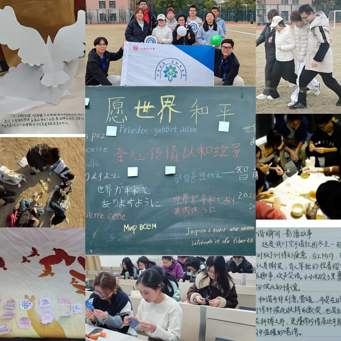 “牵心传情,以和绘景”主题活动以“趣味情报传递”游戏开场,同学们用肢体语言传递和平寄语,在欢笑中培养默契。“和平知识抢答”环节中,大家用多国语言说出“和平”——“Peace”“Paix”“Frieden”“Pace” ……不同语言承载着同样的真挚情感。在“忆幸福”环节,同学们分享生活中的温暖瞬间,体会到和平就蕴藏在身边的善意与理解之中。活动尾声,一只只千纸鹤承载期许,一张张心愿便签拼贴成爱心,象征着对和平的坚定守护。