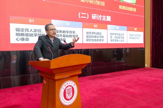 基础学部部长黄吉平就教育教学思想大讨论作出总体安排部署,针对研讨主题、职责分工、时间节点等关键事项提出明确要求,要求工作小组对照提纲,确保各项研讨工作扎实推进、落地见效。他详细传达了学校设立基础学部的时代背景、核心发展目标与重点任务,强调学部将聚焦大一学生统筹培养,筑牢学生成长成才的坚实根基,做强数学、物理等基础学科,服务于工科,培养卓越理科人才,为学校优势学科、特色学科的高质量发展提供强有力的支撑保障。