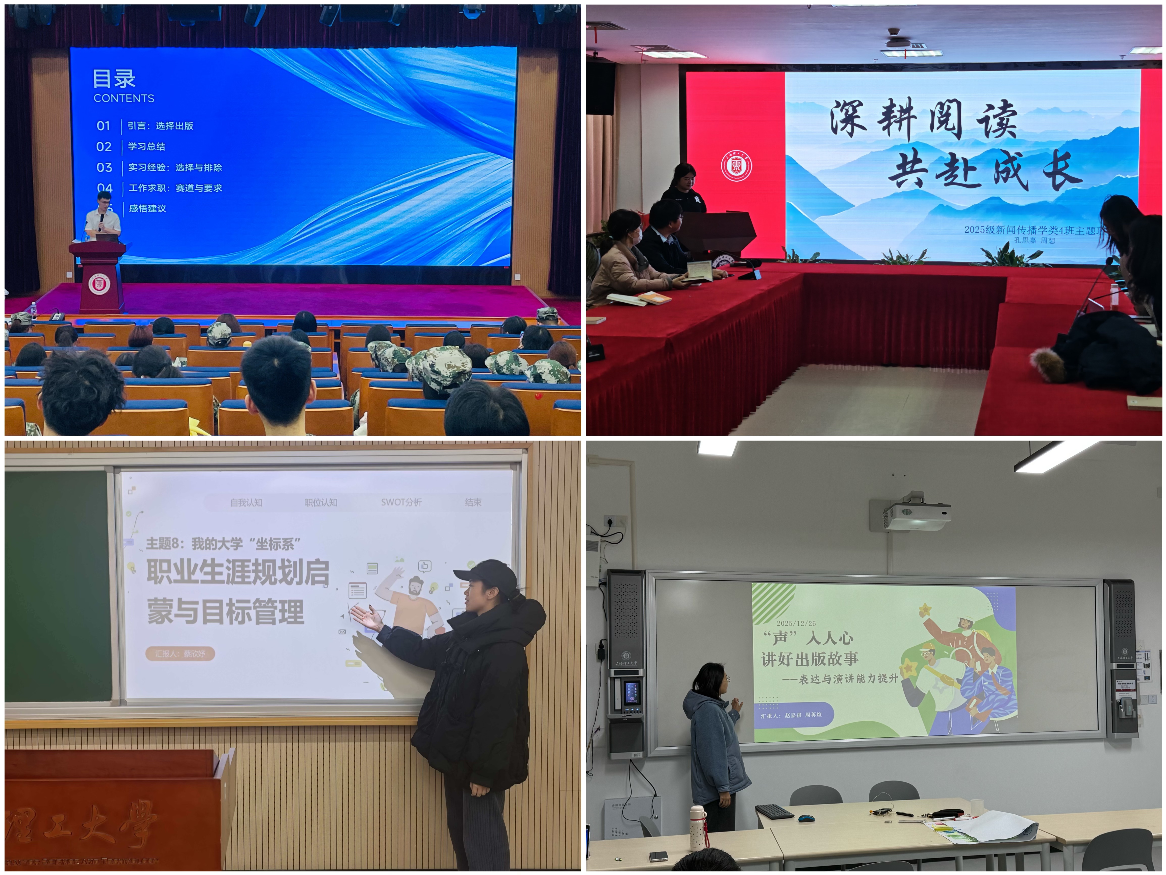 专业赋能,彰显出版育人特色。系列主题教育也紧扣出版学院专业,入学认知教育中融入院史院情介绍,学院还邀请优秀校友参与班会,分享行业前沿与职业路径,增强新生专业认同感。在“表达与演讲能力提升”主题中,学生结合自身专业兴趣开展脱稿演讲,锻炼逻辑表达与感染力;“红色文化浸润”中,学生分享革命题材画册、红色出版物插画解读精神内涵,在读书会的交流分享中,聚焦红色出版物的历史价值,厚植为出版事业育人的使命意识。