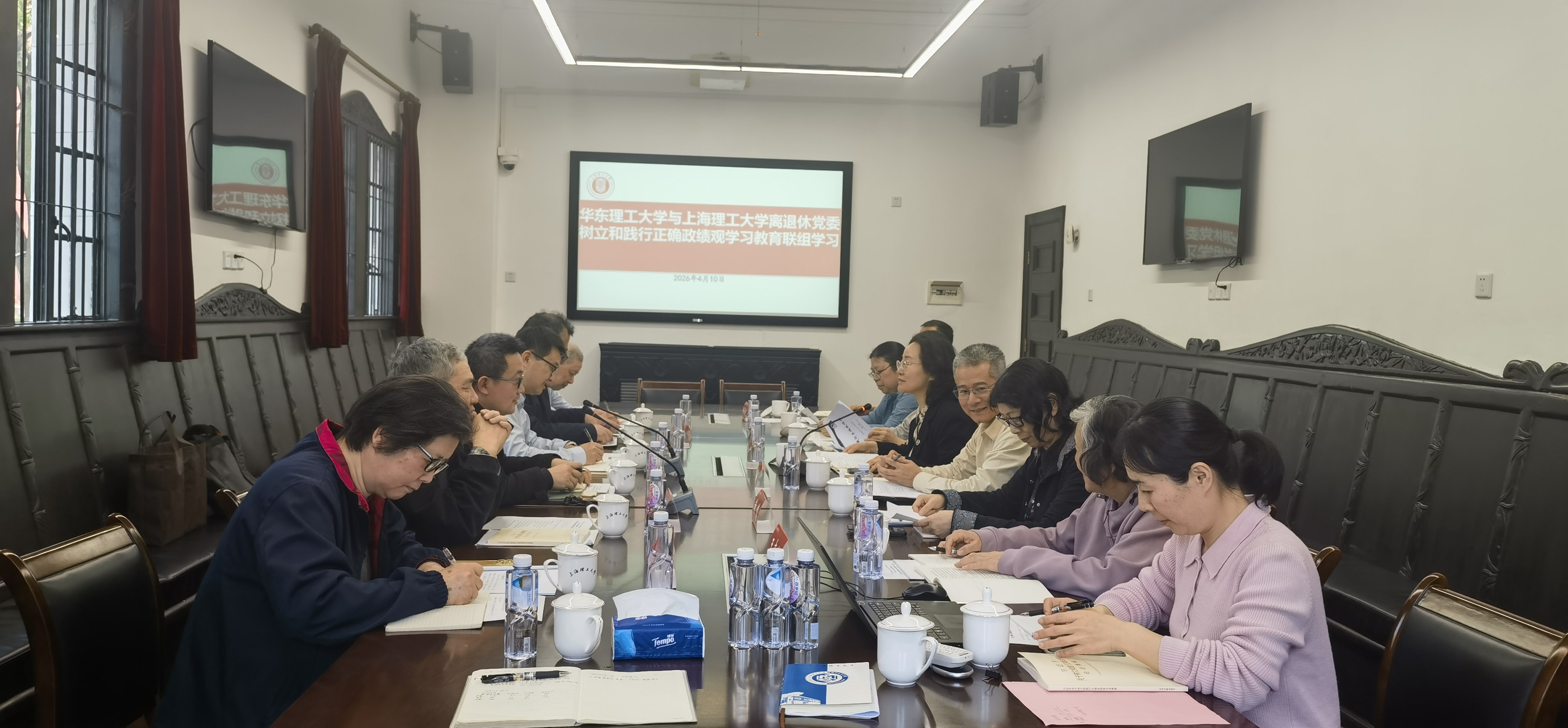 4月10日,华东理工大学与上海理工大学离退休党委以“联学共建”为载体开展树立和践行正确政绩观学习教育联组学习会。此次活动不仅是一次跨校党建工作的深度交流,更是一次引导老同志用正确政绩观看待改革发展的思想洗礼。华理工离退休工作党委书记彭辉辉一行,我校组织部副部长、老干办主任、离退休党委书记李景玉,工会副主席、退管办主任金小东,以及两校离退休党委委员参加学习。会议由李景玉主持。