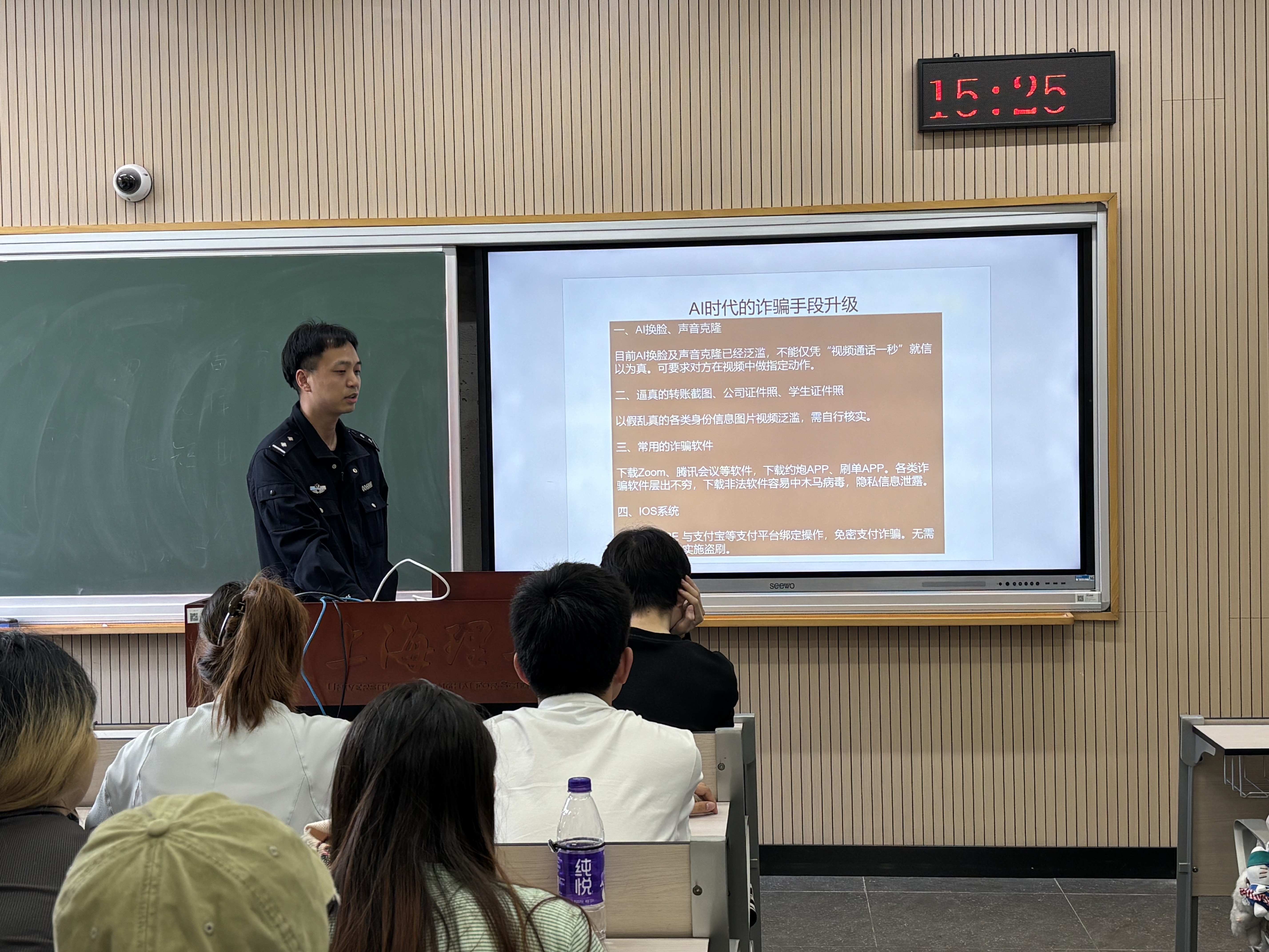 在健康科学与工程学院举办网络安全主题沙龙中,楼长、班委等学生骨干现场观看驻校民警利用“AI”技术还原电信网络诈骗场景,生动感知诈骗陷阱的关键节点。这些学生骨干通过“一站式”学生社区活动、主题班会、日常分享等方式,以身边人讲身边事,将反诈防范技能辐射至全体同学。