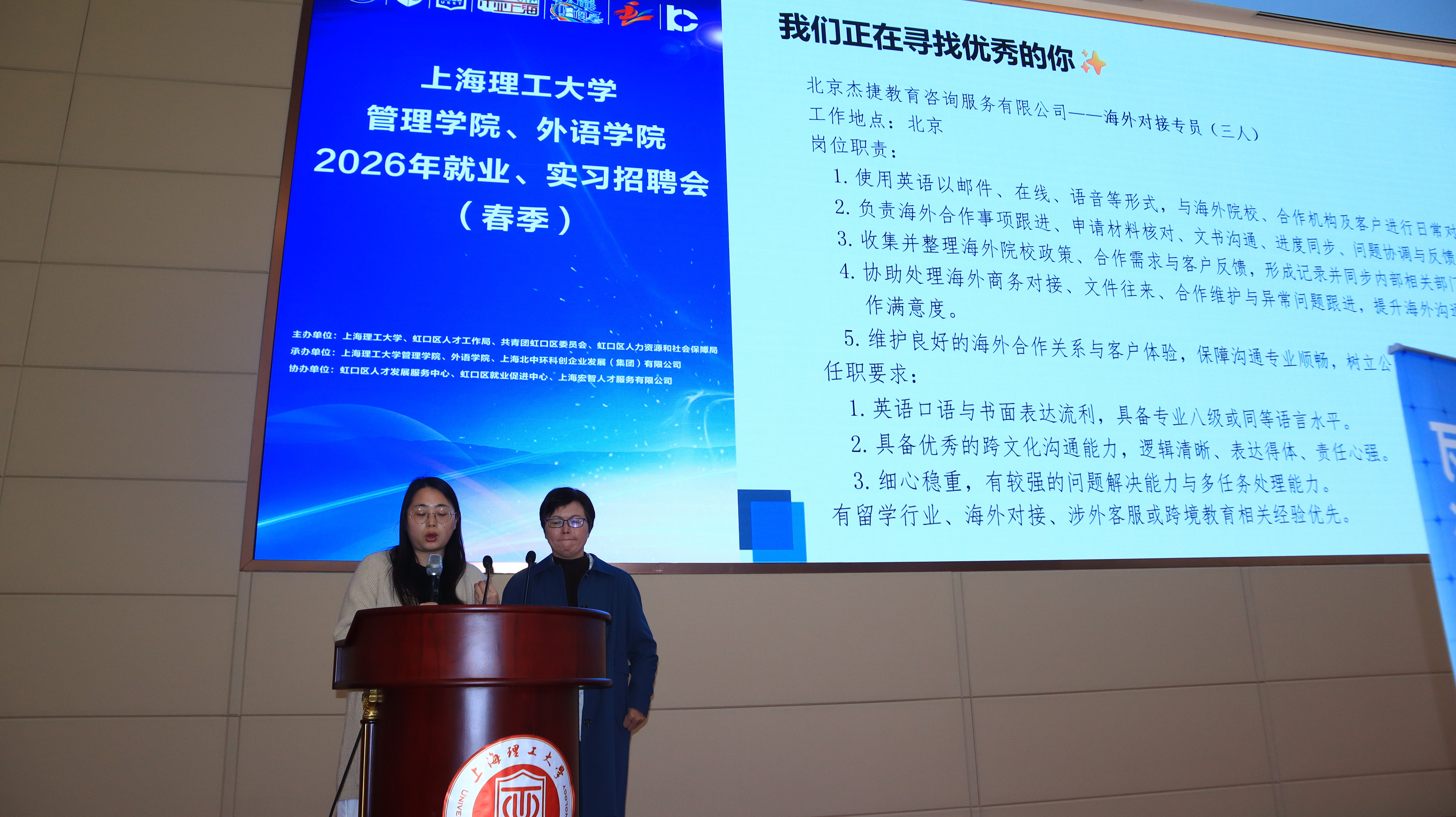此外,本次招聘会还开设了企业专场宣讲,上海宏智人才、北京杰捷教育等企业领导依次向毕业生介绍企业发展、招聘需求与人才发展平台。宣讲环节干货满满、节奏有序,有效搭建起企业与学子间高效的沟通桥梁,助力毕业生精准明晰求职方向。