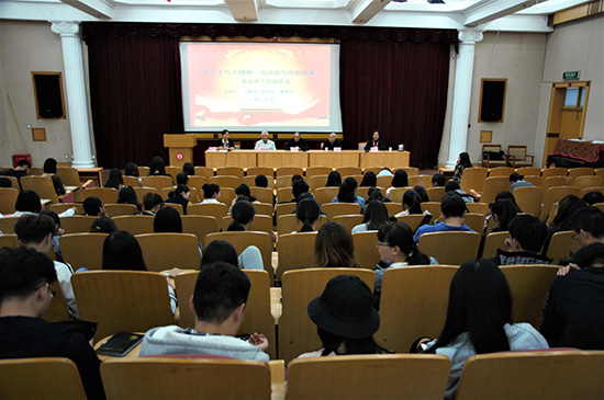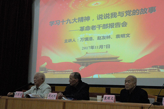 11月7日下午,管理学院在第一会议室举办了“学习十九大精神,说说我与党的故事——革命老干部”报告会,报告会同时也是学院第41期积极分子培训班的一次特殊党课。学院特别邀请了三位革命老干部作为主讲嘉宾:曾任海军航空兵领航处处长的万慎浩、曾任福州军区空军司令部军务参谋的赵友林和曾任南京军区空军32师教导大队队长的袁明文。报告会由学院党委副书记姚秀雯主持,培训班全体学员、部分学生党员代表和学生干部参加。 报告会中,万慎浩从思想高度、政治体制、经济发展、军事技术、国际形势等不同角度谈了对新时代的理解,并深情回忆了自己参与核试验基地建设的经历以及当时国家进行两弹研究的历史片段。他勉励青年学生不忘艰苦奋斗的优良传统,发奋图强,建设祖国。赵友林回忆了自己1961年入伍以来在部队的经历,生动讲述了援越抗美时期与战友们的英勇事迹,并与同学们分享了学习十九大精神的体会,对祖国的飞速发展深表自豪。最后,他动情地寄语大学生:“做好人,守规矩,读好书。”两位老先生在讲述中饱含着对国家、对党热诚而深厚的感情,也满怀着对青年学生的无限期望。这既是一堂生动的党课,也是一次革命传统教育,同学们被深深感染,甚至流下了热泪。 最后,姚秀雯对报告会进行了总结,并呼吁青年学生响应习近平总书记的号召,明确自己肩上的责任。作为见证国家从“富起来”到“强起来”的一代人,应当不忘初心、牢记使命,勇于担当,有所作为,无愧于这个伟大的时代。