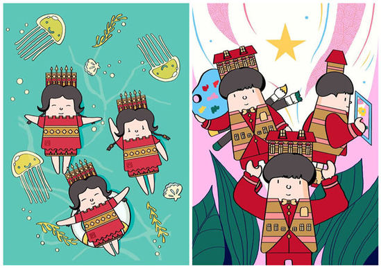 在这名“95后”创造的“516学堂”大家庭里,有建筑特色的人偶和动物一一出现,可盐可甜可卖萌,在帽子、衣服、袖口、发饰、衣领等细节处,都能找到对应建筑的元素。