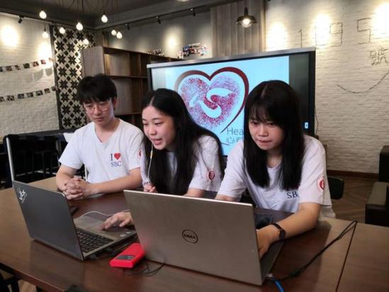 支教队员与育才小学在线互动:胡皓扬(左)、黄婷(中)、姚鑫怡(右)