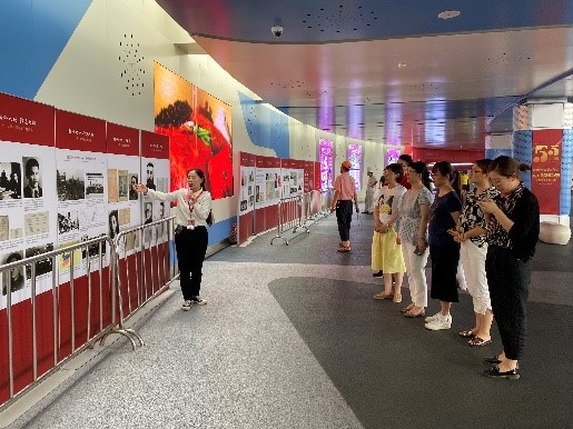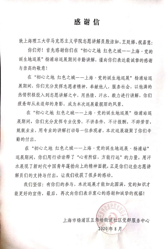 8月3日至8月10日,由中共上海市委宣传部指导,中共上海市市级机关工作委员会、中共上海市委党史研究室联合中共一大、二大会址纪念馆和中共四大纪念馆等举办的“初心之地 红色之城——上海·党的诞生地巡展”走进杨浦,在五角场下沉式广场开展巡展活动。受承办方杨浦区五角场街道党建服务中心邀请,马院新青年“四史”学习教育服务队在学院党总支的支持下,精心遴选推荐3名优秀党员担任巡展讲解志愿者,为前来参观的40余批(次)、2000余人(次)的党员群众提供了志愿讲解服务。在讲解过程中,志愿者不畏酷暑精心准备、微笑讲解,良好的精神面貌和专业的讲解服务获得社会各界的一致好评,杨浦区五角场街道党建服务中心特别发来感谢函予以充分肯定。