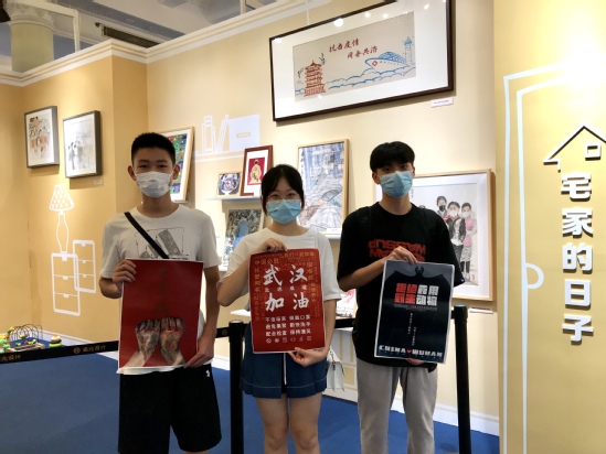 版艺学院学生将“以'艺'抗'疫'”作品带至展区并合影