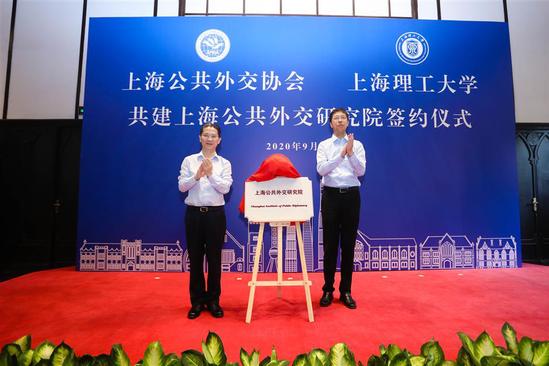Zhou Hanmin (left), president of the Shanghai Public Diplomacy Association, and Wu Jianyong, Party secretary of the University of Shanghai for Science and Technology, unveil the plaque of the Shanghai Institute of Public Diplomacy.