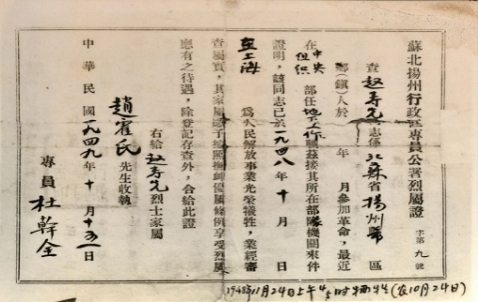 2009年是新中国成立60周年。当年9月,中共南京市委、南京市人民政府组织英雄模范人物评选活动,曾在南京求学的赵寿先烈士被授予“30位为新中国成立做出突出贡献的南京英雄模范人物”,其证书和奖章照片也被李道康整理成册。