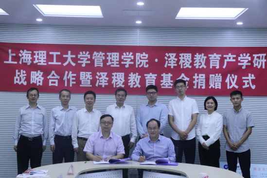 蒋望、赵来军代表双方签署产学研合作暨捐赠协议,孟宝全代表学校基金会接受泽稷教育捐赠支票。