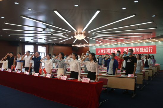 活动伊始,全体与会研究生党支部书记起立,面向党旗,举起右拳,重温入党誓词。在庄严的宣誓中,重温入党的初心。