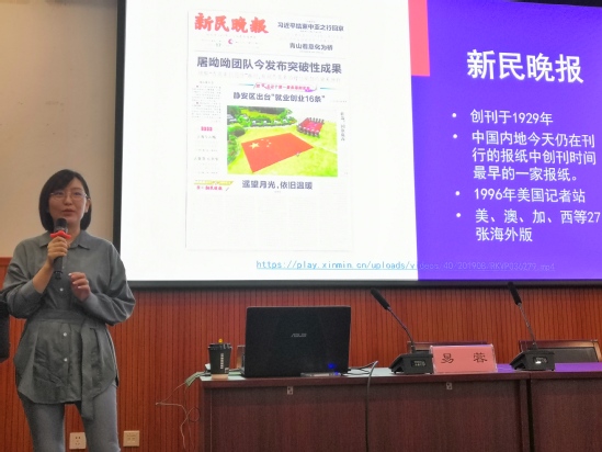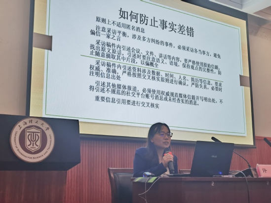 中国新闻社记者许婧从上大食堂“小鸟胃”餐食等案例出发,讲授了提升稿件“颜值”的方法,并强调报道必须“到现场、在现场、去现场”。