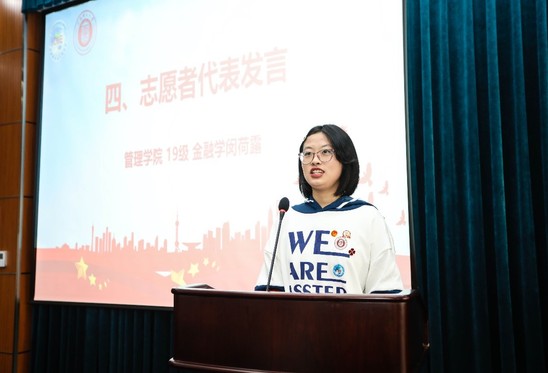 来自管理学院的闵荷露同学作为志愿者代表发言,她倡议上理工“小叶子”时刻保持疫情防控意识,以更贴心、更专业的服务,奉献进博会。