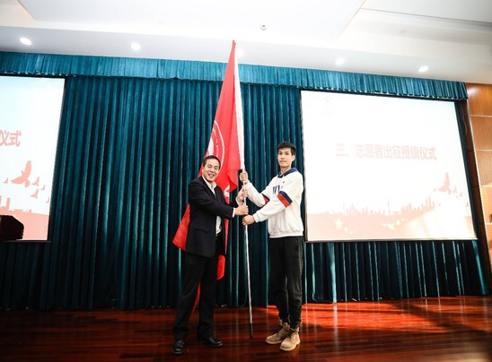 盛春向即将出征的志愿者们授旗并寄语