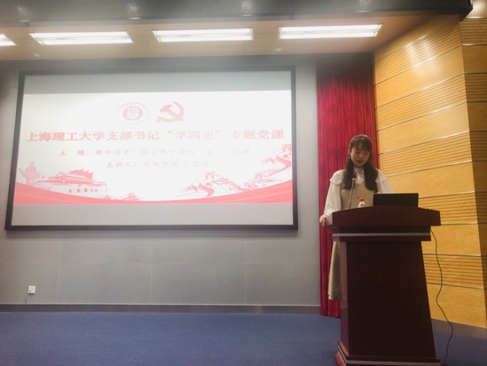 随后,来自马克思主义学院研习社的祝嘉慧、戴思雨和郭成同学围绕“初心之地、红色之城:中国共产党早期在上海”主题,分别以“伟大开端:中国共产党第一次全国代表大会”“中共二大:党的诞生之崭新局面”“顶天立地、力量之源——‘四史’教育系列宣讲之中共四大”为专题,从党的一大、二大、四大召开情况、形成的重要成果和历史影响出发,为光电学院学生党员开展党史宣讲。