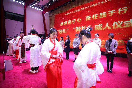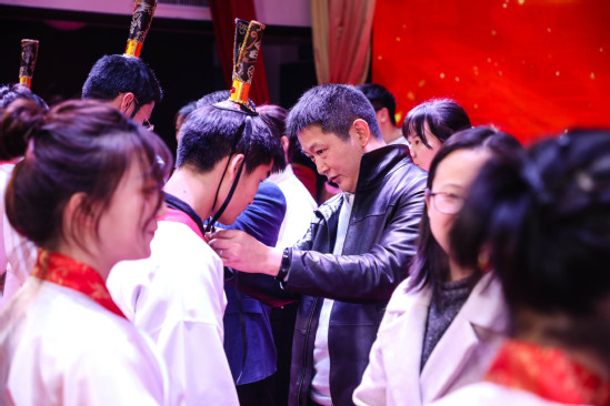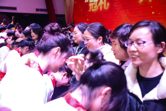 伴着典雅的古乐,学生代表身着汉服踏着轻盈的步伐,徐徐走入舞台中央。师长代表分别为男生加冠、为女生加笄。通过古朴的引语,依次完成加冠、醴礼、拜谢等传统汉式成人冠、笄礼。在此基础上,学院充分挖掘“六艺”的时代新内涵,赋予“六艺”新内容,将传统的礼乐射御书数与德智体美劳相结合,师生从书法、算术、琴乐等多方面共行“六艺”之礼,一系列沉浸式体验实现了多元化的传统文化资源和学生喜闻乐见的活动形式相结合,让传统文化看得见、摸得着,仪式教育入脑又入心。