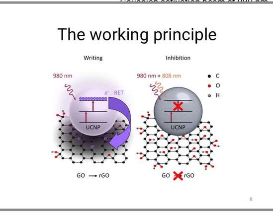 此外,这项技术使用一种新的纳米复合材料,将氧化石墨烯与荧光上转换纳米颗粒结合在一起,使用荧光上转换纳米颗粒将亚衍射信息位写入纳米复合材料,在结构光照明下局部还原氧化石墨烯,还原氧化石墨稀的过程通过共振能量转移来完成,从而降低能耗,延长光学器件的使用寿命。与传统光学写入技术使用昂贵且笨重的脉冲激光器相比,此技术使用便宜的连续波激光器,大大降低了成本。