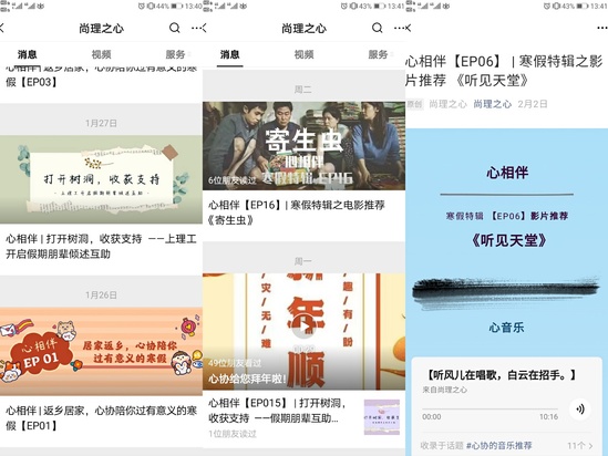 从1月26日开始,“尚理之心”公众号每日推送一篇心理保健推文,一周五天不间断,除夕春节打烊。内容包括心理书籍、电影、音乐推荐,心理话题在线互动,心理服务推荐,心理知识宣传,内容丰富,一推就是23天。这份坚守,为同学们送去了温暖,其背后是上海理工大学大学生心理协会40多位同学的付出。