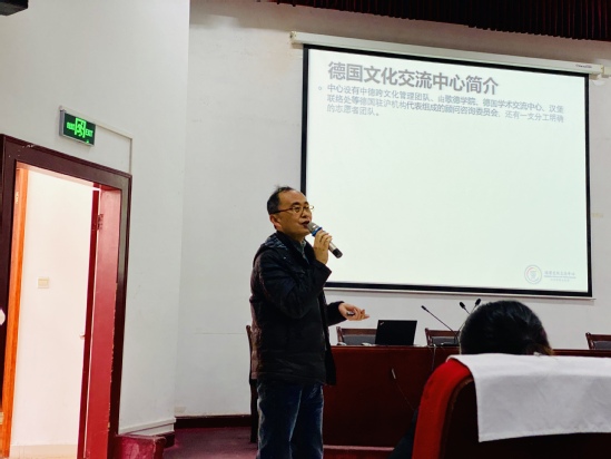 德国文化交流中心主任周卫东对中心历史以及中心设立的重要意义做了阐述,为大家展示了中心的物理空间布局,他用多组照片展现了中心自揭牌以来举办的各类特色活动,如外交官系列论坛、大师讲座、“体验德企文化、弘扬工匠精神”系列、“德奥之声”系列音乐会、摄影展、文学诗歌朗诵会、留学交流等活动,体现了中心在中德人文交流过程中发挥的重要作用。
