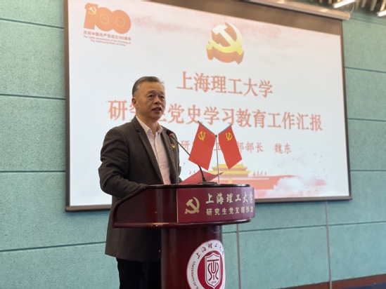 活动伊始,魏东代表党委研究生工作部作关于推进上海理工大学研究生党史学习教育工作汇报。他指出,要用党的奋斗历程和伟大成就鼓舞斗志、坚定信念、凝聚力量,传承上海理工大学研究生“在党言党、在党为党、在党爱党”的红色传统,展现研究生时代风貌,通过“三大”举措(“大学习”“大讨论”“大实践”)在党史学习教育落实落细上下足功夫。