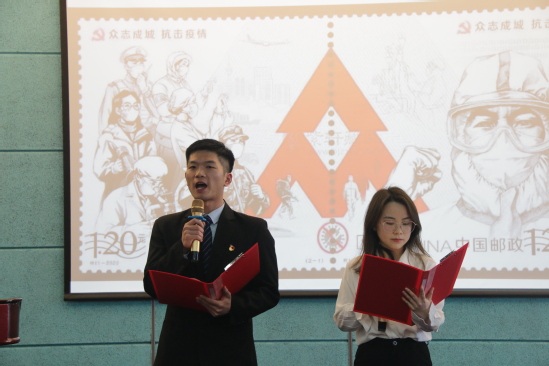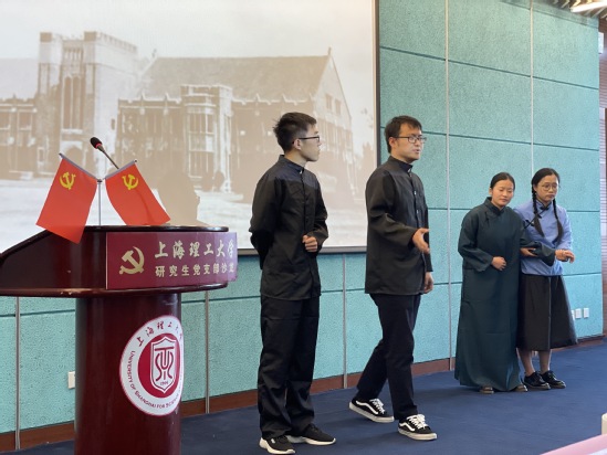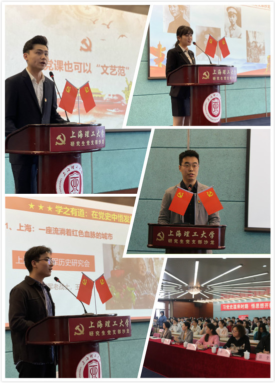在党员大讲堂环节,版艺学院工文艺研究生第二党支部代表周伟峰、机械学院机械设计研究生党支部代表魏久翔、能动学院2019级硕士研究生第一党支部代表孙辉、马院研究生第二党支部代表付青分别讲授“学党史看发展,担责任传薪火”“数英雄人物,重温红色记忆”“红歌飘万里,唱响新中国”“百年铸辉煌,热血谱华章”专题党史课。周伟峰从电视剧“觉醒年代”切入,指出新时代青年党员要从书本、从人民群众、从上海、从上理工学习鲜活党史,在学思践悟中坚定理想信念,在奋发有为中践行初心使命;魏久翔通过周恩来、毛泽东、杨靖宇等党员的经典事迹和中共一大的召开、南昌起义、红军长征、三大战役等主要转折点讲述了党的光辉历程;孙辉以“没有共产党就没有新中国”“学习雷锋好榜样”“一条大河波浪宽”“走进新时代”等5首红歌为线,串起了中国共产党带领中国人民奋勇拼搏、取得伟大胜利的历史;付青以20岁青年党员应该做什么引入,通过青年党员中的战“疫”天使、脱贫攻坚党支书身影,激励在座青年要争做有朝气、有担当、有魄力的时代新人。