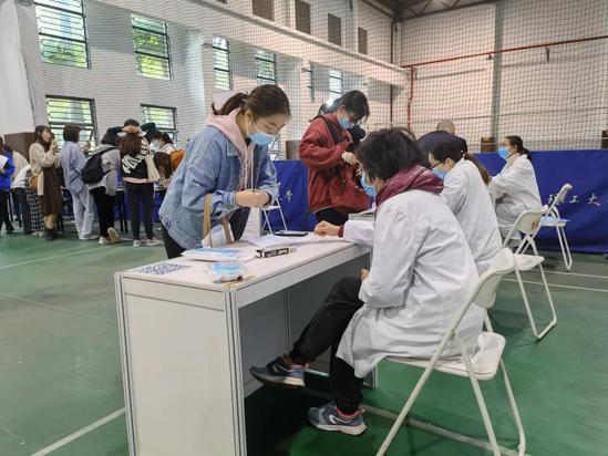 从早上8点开始,师生们按照学院,分时段、分批次来到接种点,排队扫码登记进场。随后在工作人员的指导下,大家严格按照流程完成疫苗接种。记者注意到,在预检区,医务人员会仔细询问师生身体状况,如“你最近有什么不舒服吗?有吃过药吗?今天有喝过酒吗?有对什么过敏吗?”等等,来判断其是否符合接种条件。