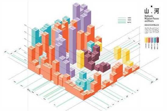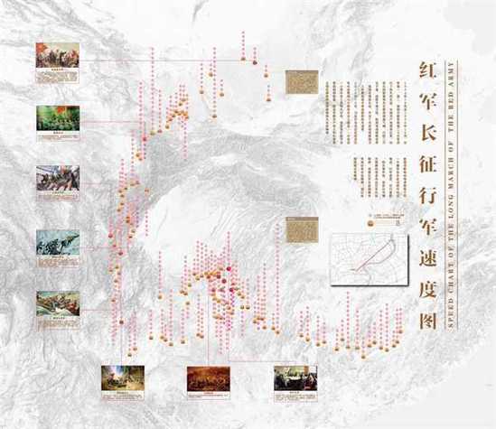 作品《红军长征行军速度图》和《红军长征所历经的高山河流》就把长征路程上人们难以想象的种种困难,用可视化数据清晰地揭示出来。地图上,黄色的圆点代表当天行军到达的地点,并标明停留的日期。圆点上方的每一个粉色小圆点代表10公里的里程,有时候为了强行军,战士们要忍受饥寒,在崎岖的道路上一天一夜行走一百多公里。况且,长征的旅程经过的大部分地区自然条件都十分艰苦,这些高原、雪山相比于我们熟悉的风景名胜,海拔要远远高得多。这些数据的图形化展现,更容易让观众建立直观的想象,体会先辈们革命精神的顽强和伟大。