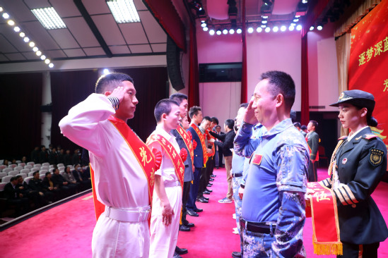 现场,应邀从山东青岛赶来参加主题活动的逐梦深蓝讲师团成员和教师代表,共同为2021年退伍大学生佩戴绶带。30名退伍大学生依次以洪亮的声音报出他们原部队番号:“中国人民解放军92132部队张楠!(海军青岛舰原副舰长)”“中国人民解放军91091部队袁兴池!”“中国人民解放军驻香港部队简涛!”“武警海警总队浙江支队董向峰!”……声浪震天,回荡在礼堂上空,也激荡在每一位师生心中。