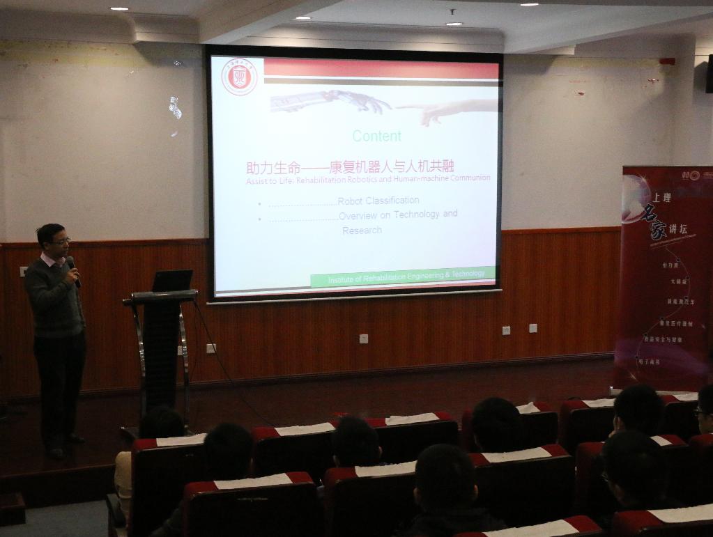 第五讲《助力生命——康复机器人与人机共融》 上海康复器械工程技术研究中心主任,医疗器械与食品工程学院喻洪流教授运用多段康复机器人模型和应用情况视频,展示了目前国内外及我校团队研制的最先进的康复机器人模型,展望了人机共融技术在人类健康研究领域中的前沿科技与发展趋势。