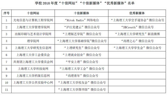 “十佳网站”的评选主要采取自评和专家评审的方式。校内外评委从网站的管理制度、信息发布审核机制、信息更新频率、网站安全措施等方面进行综合考量。最终,光电信息与计算机工程学院网、上海理工大学公共实验中心网等10个二级网站获得“2018年度十佳网站”称号。