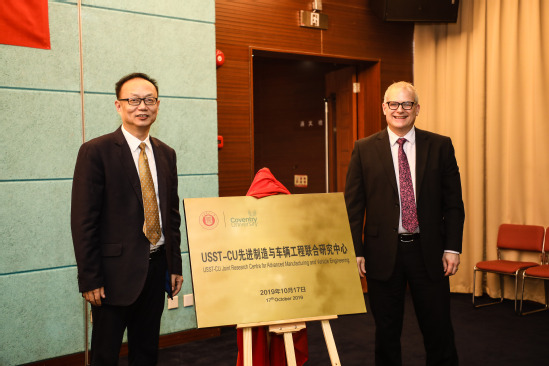 刘平副校长致欢迎词,他高度肯定了双方此次交流合作的意义,指出联合研究中心的建立必将进一步推动我校高水平大学建设。Richard Dashwood副校长表达了对双方后期合作研究的期待,并对考文垂大学整体情况进行了介绍。刘平副校长、Richard Dashwood副校长分别代表双方学校共同签署了共建“USST-CU先进制造与车辆工程联合研究中心”协议,并为研究中心揭牌。