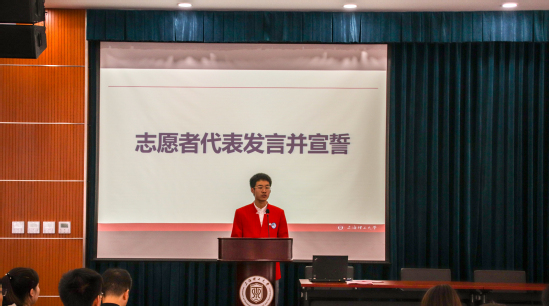 我校青年志愿者协会主席尚凯同学作为志愿者代表发言,他表示,上理工的志愿者将坚持积极参与、无私奉献、乐于助人的志愿服务精神,认真做好本次进博会的一切志愿服务工作,承担起新时代青年人为国家、为社会的责任,向世界展现当代中国青年积极向上的优秀风貌。