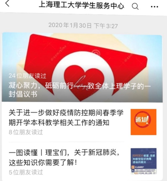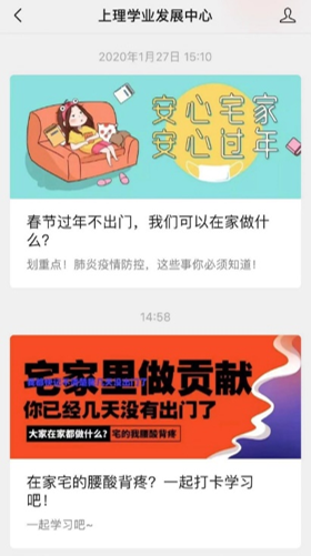 抗击疫情,思想稳定是关键。为引导学生提高政治站位,理性看待疫情,学生服务中心、学业发展中心、学生宿管会等多个公众号平台发出“致上理学子的倡议书”、宣传“疫情防范知多少”、开展“21天线上学习打卡”,做好抗击疫情的宣传教育工作。