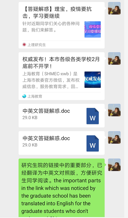 沪江学院国际学生辅导员李娇实时关注110名在校国际学生的身心健康情况。她密切联系国际学生办公室、保卫处、医务室和后勤,协同为国际学生解决封闭管理下的生活学习问题。面对国际学生因来自不同的文化环境和社会背景,存在对疫情期间封闭校园管理规定不理解的情况,她心理感化与严格要求并举,电话微信同时用,链接打字表情包齐上阵,将权威媒体报道、学校的重要通知、辟谣链接等翻译成英文发给他们,不厌其烦地耐心做好学生心理疏导工作。