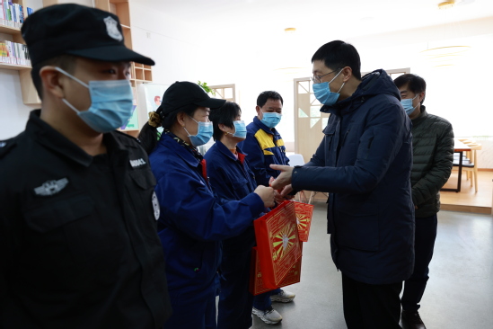 校领导一行先后慰问了第一食堂、学生公寓、保卫处、门卫室、清真食堂的值守人员,向他们致以节日问候,感谢他们假期坚守岗位热心服务留校师生,并送上精心准备的慰问品。在南区新建食堂综合楼室内施工现场,校领导仔细询问了工程进度、区域划分和功能设计等方面的细节,强调新食堂既要体现新时代大学食堂水平的高标准,也要成为上理工以师生为本、坚决落实“五个人人”的靓丽风景线。希望有关部门精准谋划,找准定位,不仅要节能环保、安全卫生,更要风格清新、功能兼容,使其成为符合师生现代审美和交叉需求的多功能综合体。每到一处,校领导认真检查了各项安全责任的落实情况,要求各部门一定要时刻绷紧安全这根弦,值岗人员要坚守岗位、敢于担当,合力做好校园安全稳定和疫情防控工作,维护好全体师生的身心健康,确保全体师生度过平安祥和的节日。