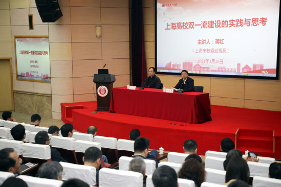为加快推进学校高水平大学建设,确保“十四五”开好局、起好步,作为学校党史学习教育的重要内容,3月26日上午,市教委巡视员蒋红应邀作题为“‘双一流’建设的实践与思考”的专题辅导报告。全体校领导、中层干部、正教授、辅导员、学校优秀年轻干部培训班学员参加。会议由校党委书记吴坚勇主持。