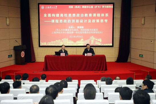 3月30日下午,校、院(机关)两级中心组(扩大)学习报告会暨课程思政专题报告会在综合楼报告厅举行。教育部思政理论课教学指导委员副主任,上海市人大外事委员会主任、侨务民族宗教委员会主任,上海学校大中小思政课一体化指导委员会专家组组长高德毅教授应邀作主题报告,校领导、全体中层干部、各专业负责人、教师代表出席会议。会议由校党委书记吴坚勇主持。