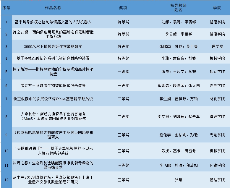机械学院《基于多模态感知的系列化智能穿戴防护装置》、健康学院《基于具身多模态控制与情感交互的人形机器人》《持之以衡--面向多应用场景的高动态低延时智能平衡系统》,理学院《3000米水下插拔光纤连接器的研发》获大赛特等奖,能动学院《控宇衡湿——斯特林驱动的宇航空间站高效控湿装置》、光电学院《微立方—多域微生物智能感知消杀装备》获一等奖,管理学院《人享其行:新质交通背景下出行即服务(MaaS)系统发展困境与优化对策研究》、材化学院《低空救援中的多层级结构MXene基智能穿戴系统》获二等奖。