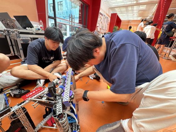 备赛期间,正值学校短学期,同学们几乎每天都在上课教室和工程实训中心的训练场地之间日夜拼搏。白天,他们奔赴各个教学楼完成专业课程的学习与考试;夜幕降临,训练场地便成了第二个“家”,机械臂调试的嗡鸣声、代码敲击的键盘声与队员们的讨论声交织在一起,经常一直持续到深夜。为了攻克机械结构稳定性不足的难题,队长带着机械组同学连续多天泡在加工车间,反复调整零件适配度;编程组则针对赛事新规则连夜优化算法,在一次次模拟对抗中调整参数,确保机器人在复杂工况下也能精准执行指令。尽管高强度的备赛让大家身心俱疲,但每当看到机器人在测试中完成一套流畅的动作,或是在模拟赛中取得突破,所有的辛苦都化作了继续前进的动力。