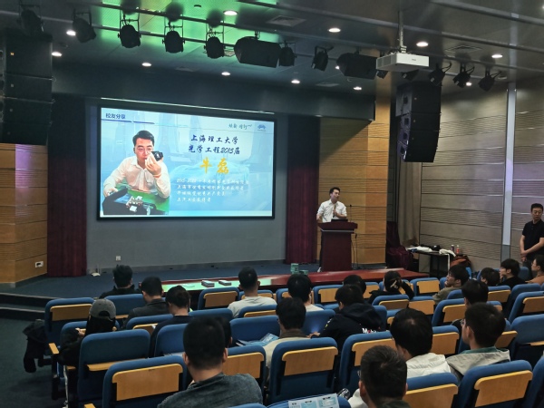 牛磊校友以亲切的学长身份,首先分享了自己在上海理工大学求学期间的点点滴滴,讲述了如何将从课堂上学到的光学、电子、机械等专业知识,与课后参与的科研项目和实践竞赛相结合,为日后职业生涯打下坚实基础的经历。他特别提到,母校“信义勤爱、思学志远”的校训和严谨的学风,至今仍深刻影响着他的工作态度与职业发展。