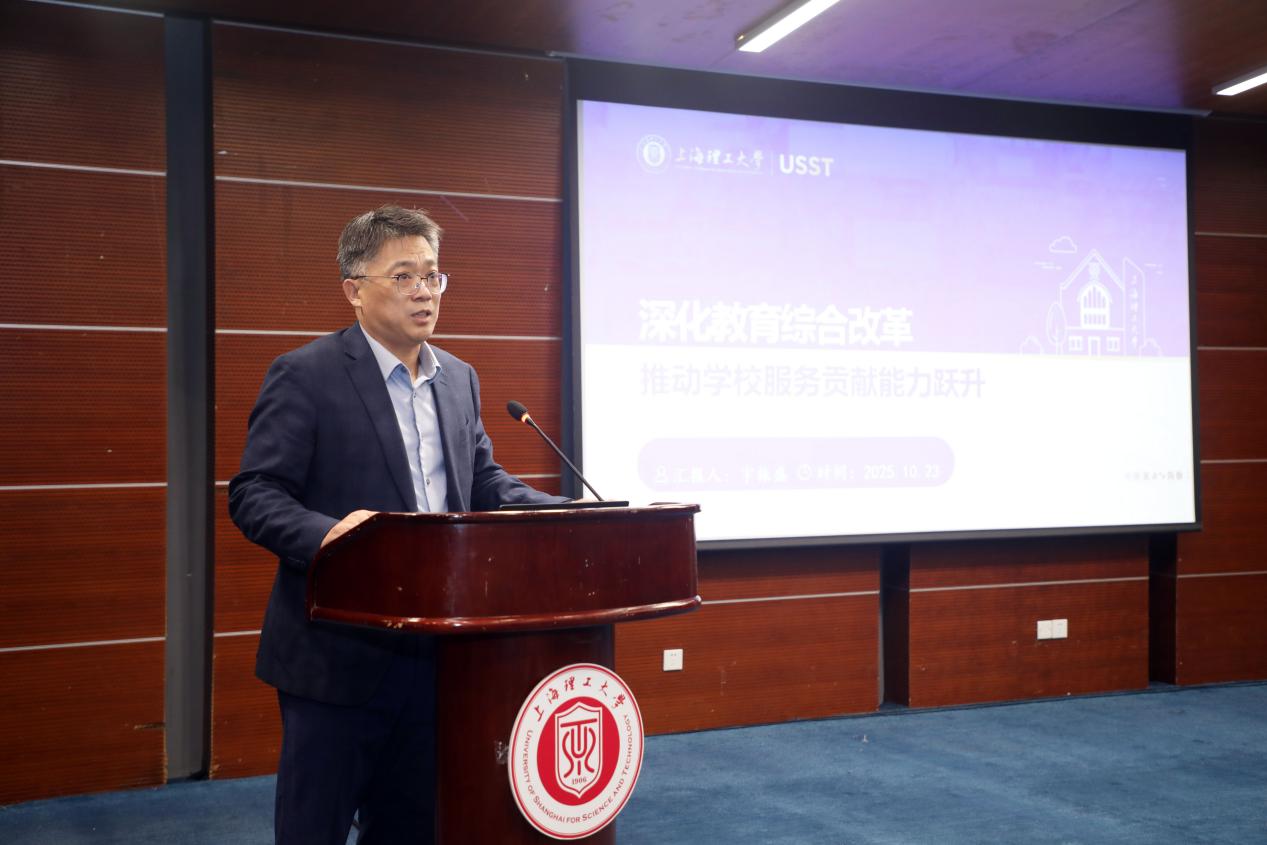 王凌宇主持并讲话。他从全球高等教育变革、中国高等教育改革、学校发展历史等三个维度分析了此次教育综合改革的背景。他强调,“重服务、强贡献”已经成为引领新一轮高等教育改革的价值导向,学校事业发展面临的瓶颈难题迫切需要用好改革关键一招。要以时不我待的紧迫感抢抓改革机遇,把自身发展融入服务国家战略和上海发展之中,答好第九次党代会提出的“上理三问”。要发挥好先行先试作用,不断深化产教融合,更加注重微观层面改革,重点抓好六大重点服务领域牵头学院、重点学科、教授团队层面的改革落实,通过持续改革实现学校整体性发展跃升,努力走出地方高校“双一流”建设的新路。最后他希望全体教授以主人翁精神参与、支持、推动学校教育综合改革,以更高标准、更好质效做好教学与科研工作,努力在推动改革实践中发挥带头作用,在对外合作中发挥带头作用,在潜心科研、教书育人上发挥带头作用,团结一致、接续奋斗、攻坚克难,努力书写学校事业发展的新篇章,为即将迎来120周年校庆交上一份优异答卷。