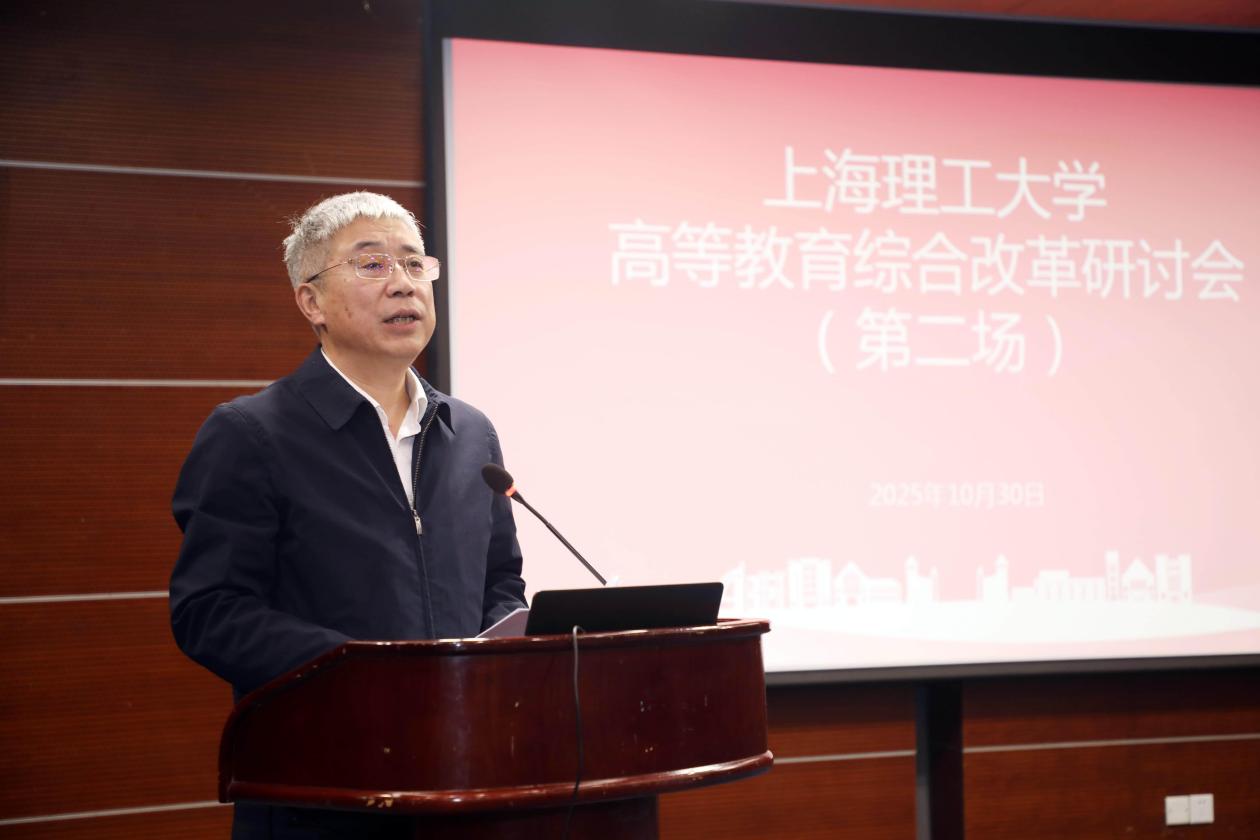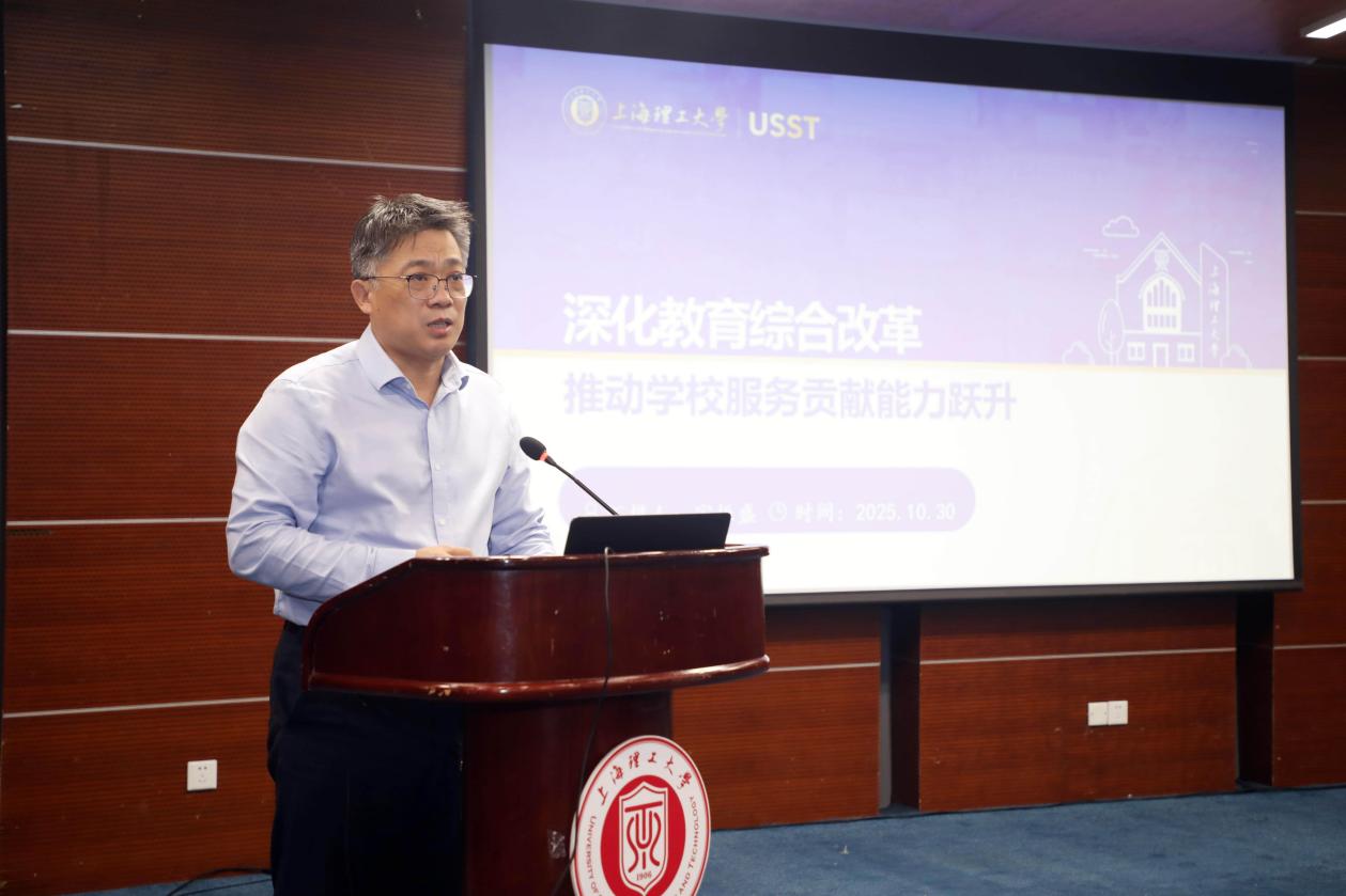 王凌宇主持并讲话。他首先从国家、上海市、学校三个层面分析了教育综合改革的背景。他指出,青年教师是学校事业发展的生力军,要紧紧围绕学校新的办学定位,切实真正理解领会教育综合改革的目标和重点任务。要牢牢把握“重服务、强贡献”价值导向,积极应对新的办学评价方式对学校和教师个人发展带来的机遇和挑战。学校将着力营造良好的制度文化,增强各类工作机制的协同协调,努力营造促进教师分类发展、人尽其才的良好环境。他希望全体青年教师成为学校教育综合改革的先锋力量,始终以改革创新的心态,不断深化产教融合,加强交叉融合;始终以开放合作的心态参与开放办学,争取更多办学资源和支持;始终以共生共荣的心态,努力与改革同向同行、同频共振,确保改革蹄疾步稳、行稳致远。希望全体教师深入推进综合改革落地见效,不断提升人才培养质效和科技创新供给水平,全面提升学校的社会服务贡献力,为加快高水平科技自立自强,引领发展新质生产力做出更大贡献。