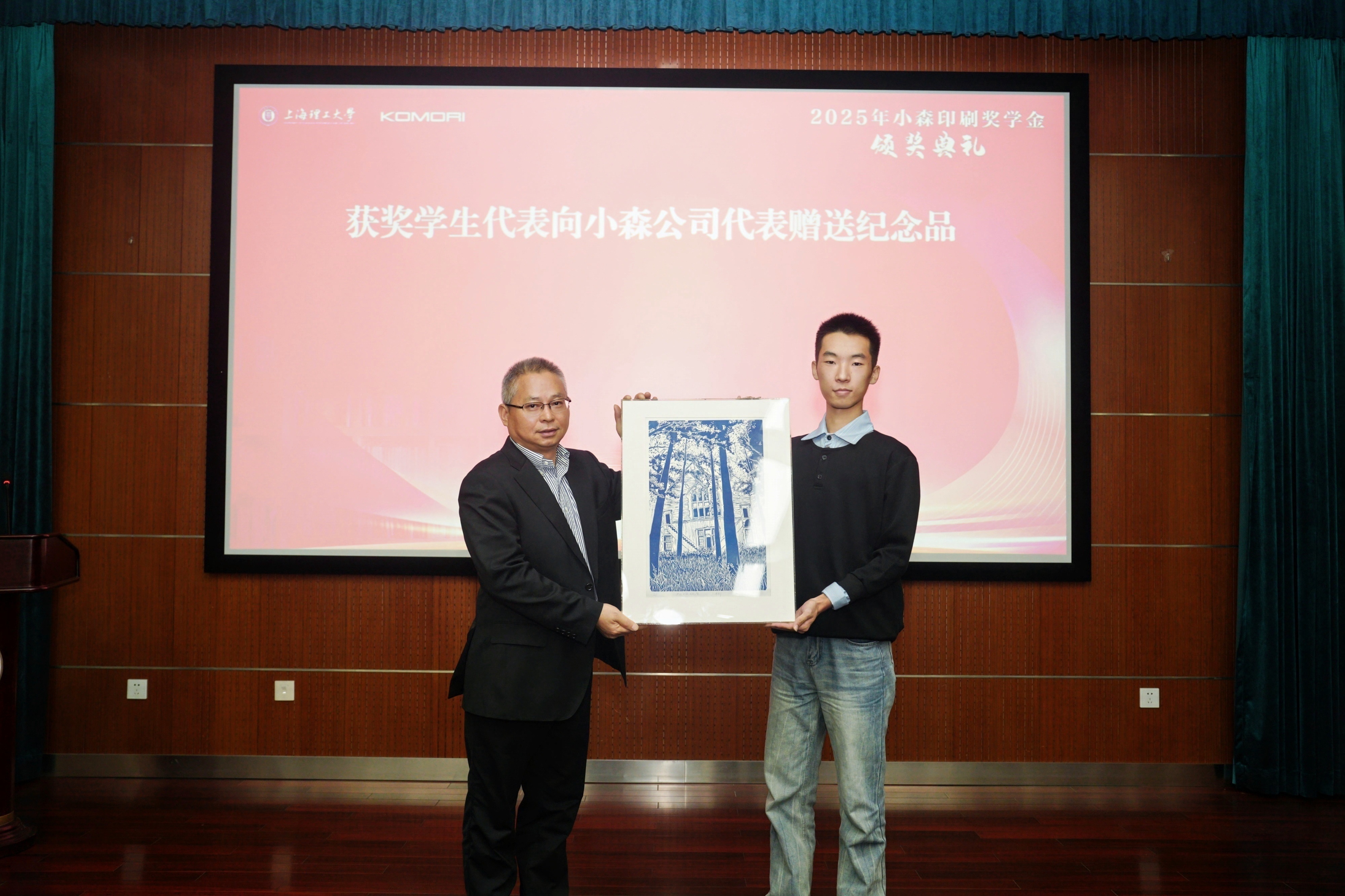 出版学院2022级新媒体技术专业学生冯月明作为获奖学生代表发言,她分享了自己在校期间取得的优秀学业成绩以及丰富的社会实践经历,并表示这些成就不仅源于个人的拼搏努力,更与学校的培养以及小森公司对学校教育事业的支持密不可分。获奖同学代表李姝贤向小森公司赠予纪念品,该画以我校北欧大草坪历史建筑群为原型,采用传统的手工版画技艺制作而成,展现了两国之间的友好合作以及我校对小森公司的美好祝愿。
