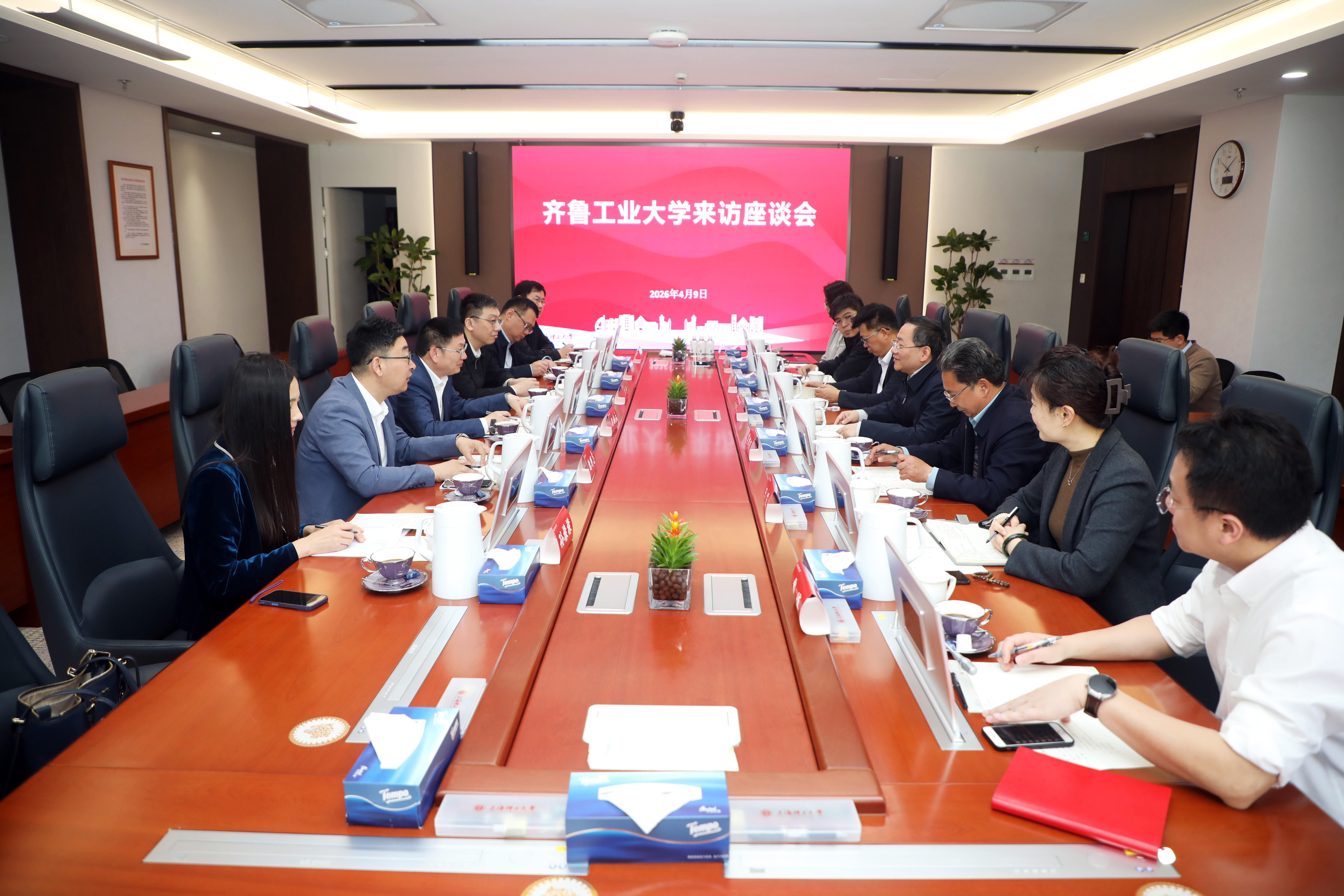 4月9日,齐鲁工业大学(山东省科学院)党委副书记、校(院)长段培永一行来访我校,党委副书记、校长朱新远会见,党政办(地方办)、人事处、科研院、研究生院、规划处等部门负责人参加座谈。