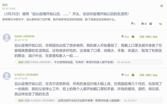 团队老师将关心留学生疫情中的生活和传递中国政府与全球合作抗疫的理念融入每一天的日常教学中。在各门对外汉语的课堂中,与学生一同阅读疫情中的暖新闻,沟通疫情中的日常,并开展多种有趣的课堂活动,让汉语课堂充满爱和欢乐。在讨论区,学生们用汉语交流疫情中的居家防疫办法,化解紧张情绪。当被要求用“一旦”造句,谈谈疫情结束后最想做的事情时,大家热切地表示“最想回到中国,中国是第二个家。”